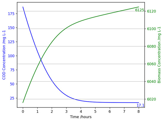 A graph showing chemical oxygen demand concentration (mg L−1) and biomass concentration (mg L−1) against time (hours) for the mathematical model of an aerobic granular sludge continuous flow reactor with an influent chemical oxygen demand of 187 mg/L, at 20 °C, 1 atm, and an HRT of 4 h.
