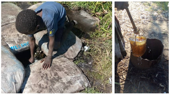 In many areas of Zambia, access to improved sanitation facilities remains limited, making pit latrines a common choice for households in rural areas. Pit latrines can be a form of improved sanitation if they are “designed to hygienically separate excreta from human contact” [1] (p. 96). A slab composed of durable and easy to clean material is one way for pit latrines to be classified as improved. In our study sites, however, the latrines are unimproved. They are generally simple, hand-dug structures, typically approximately 2 m deep, lacking a slab and constructed using local materials (see Figure 2).