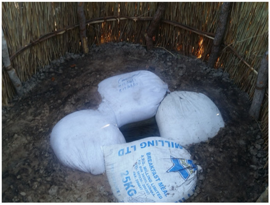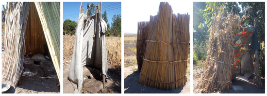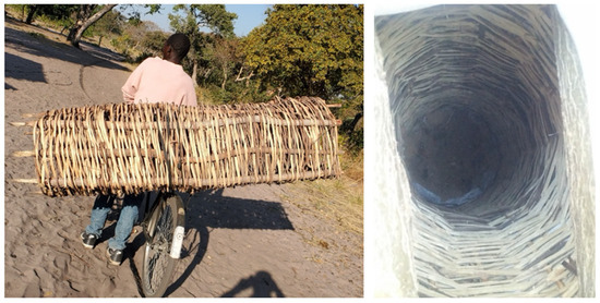 A critical factor in our study area is the predominantly sandy soil, which makes pit latrines highly susceptible to collapse. To counter this possibility, the pit walls are lined using woven twine, sticks, and reeds. These pit liners are called singangabela (see Figure 3). Pit latrines in the region often lack a concrete slab because of the high cost of cement and instead use sandbags around the latrine opening for users to stand on (see Figure 4). Given that the area is sand covered, residents collect the sand directly from their immediate surroundings and typically pack the sand into used cornmeal (mealie meal) bags. These bags are generally large, durable, woven polypropylene bags that are universally available in each household, as mealie meal is a staple food in Zambia. Although more affordable than a concrete slab, the possibility of the bags harboring bacteria makes these latrines a form of unimproved sanitation. The latrines in the region also incorporate a variety of shelters for privacy and shelter from the elements. Most often, the shelters are constructed using reeds and grass, but other materials, such as excess iron sheets, are used when available. The design generally aims to keep the interior relatively dark to discourage flies, while still allowing some airflow for ventilation.