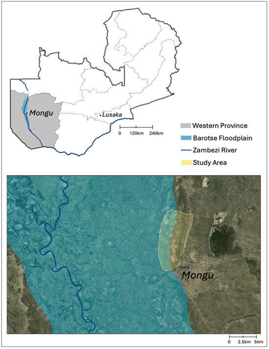 Rural livelihoods in the area are intricately linked to the seasonal flooding of the Zambezi River. The extent of the Barotse Floodplain is highlighted on Scheme 1 and it is the second largest wetland in Zambia. The rainy season in Barotse Plain begins in December and ends in May. Peak flooding occurs in April, about 3 months after peak rainfall; approximately 1500 mm of rain falls over the headwaters of the Zambezi annually [27]. During the peak flooding period, the Barotse Plain is transformed into a large water reservoir, approximately 5–6 m in depth and covering an area of over 10,000 km2 [27]. It takes about 4 months for floods to recede from their maximum inundation [26]. Most of the villages located in the plain have a corresponding high-ground village that people use during peak flooding. People return to the same village on higher ground each year, and it shares the same name as the village in the plain. For example, the village of Naloyela exists on the floodplain and on higher ground and is referred to as Naloyela ya kwa plain and Naloyela ya kwa ng’ambamo, respectively. Although some people have permanently relocated to higher ground to avoid the inconvenience of seasonal moves, they still travel to the plain daily to access their crops, cattle, and livelihoods. Climate change has affected the timing of the flood, with flooding happening both earlier and later; these changes make it difficult to prepare, including knowing when to relocate [28]. The Intergovernmental Panel on Climate Change categorized the Zambezi as the river basin expected to face the worst potential effects of climate change among 11 major African basins [29].