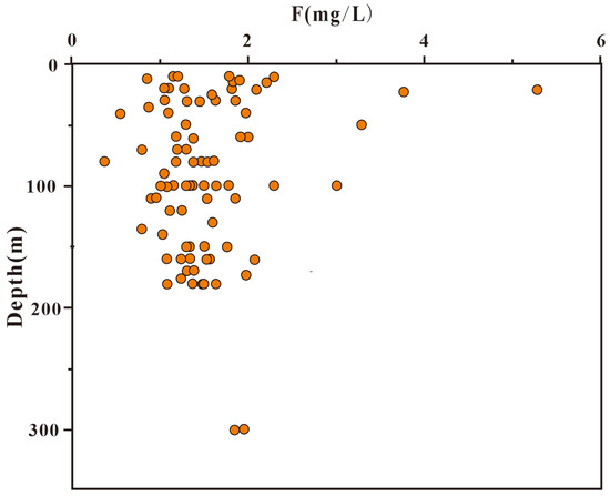High-fluoride groundwater exhibits a certain degree of spatial zonation. Vertically (Figure 5), groundwater samples at depths greater than 100 m generally have fluoride concentrations between 1 and 2 mg/L. For samples from depths shallower than 100 m, most also fall within the 1–2 mg/L range, but some exceed 2 mg/L, with a maximum value of 5.30 mg/L. Considering the confined aquifer roof depth at approximately 100–120 m, it is generally observed that the fluoride concentration in shallow unconfined water is higher than that in confined groundwater. Horizontally, from the sloping plains on the east, west, and south sides to the central river valley plain, groundwater fluoride concentrations tend to increase (Figure 5). In terms of temporal variation, a comparison was made with some data from the same sampling locations collected a decade earlier. The results show that F− concentrations only exhibited slight fluctuations, with no significant differences.