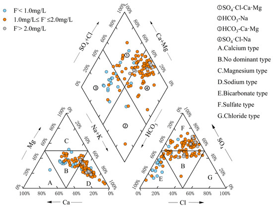 The Piper trilinear diagram illustrates variations in major ion composition and the hydrochemical characteristics of groundwater, and is used to classify hydrochemical types [26]. According to Figure 6, the groundwater in the study area can be divided into four hydrochemical types: SO4·Cl-Ca·Mg type (Region 1), HCO3-Na type (Region 2), HCO3-Ca·Mg type (Region 3), and SO4·Cl-Na type (Region 4). Most groundwater samples fall within Region 4 (SO4·Cl-Na type), followed by Region 1 (SO4·Cl-Ca·Mg type) and Region 3 (HCO3-Ca·Mg type). Only three samples (2.75%) are classified as HCO3-Na type. Furthermore, the Piper diagram shows that high-fluoride groundwater samples (F− > 2.0 mg/L) are mainly of the SO4·Cl-Na type, suggesting a correlation between fluoride concentrations and SO42−, Cl−, and Na+ concentrations.