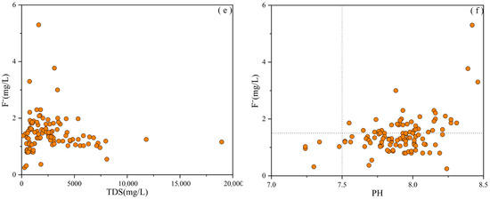 The basic hydrochemical characteristics of groundwater can reflect its conditions and provide a basis for studying its overall evolution and formation processes [25]. In the study area, groundwater pH values range from 7.24 to 8.46 (averaging at 7.90), indicating weak alkalinity. The quantities of total dissolved solids (TDSs) range from 132.00 to 18,950.00 mg/L (averaging at 2647.07 mg/L), suggesting slightly brackish to brackish water in some areas. F− concentrations range from 0.25 to 5.30 mg/L (average 1.47 mg/L).