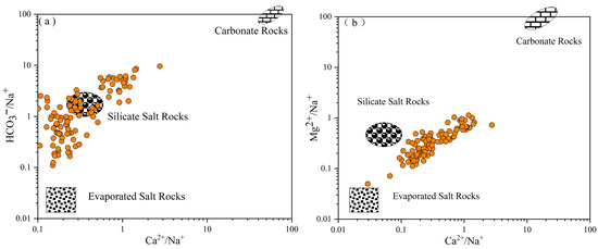 Relationships between HCO3−/Na+, Mg2+/Na+, and Ca2+/Na+ in groundwater (a) (Ca2+/Na+)/(HCO3−/Na+); (b) (Ca2+/Na+)/(Mg2+/Na+).