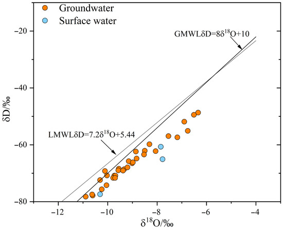Hydrogen and oxygen isotopes are effective indicators of water recharge sources [36,37]. Table 2 presents the isotopic characteristics of groundwater and surface water in the study area. Groundwater δ18O values range from −11.16‰ to −6.34‰ (average −9.07‰), and δD values range from −81.64‰ to −48.68‰ (average −66.6‰). Surface water δ18O values range from −10.31‰ to −7.78‰ (average −8.64‰), and δD values range from −77.39‰ to −60.69‰ (average −67.72‰). Groundwater samples exhibit higher enrichment of heavy isotopes compared to surface water.