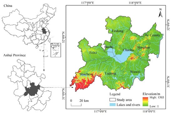 The Chaohu Lake Basin covers an area of approximately 13,486 square kilometers, encompassing Hefei City and its surrounding eight counties and districts, with a total population of about 11.87 million, representing 19% of Anhui Province’s population. The basin extends to the Jianghuai Watershed in the north, the Yangtze River in the south, the Dabie Mountains in the west, and the Chu River Basin in the east. This watershed has a high level of economic development, accounting for more than one-fourth of Anhui Province’s GDP. It serves as a crucial commercial grain production and processing hub and plays an essential role in sustainable regional water resource utilization and ecological environmental improvement [24]. However, it is also a significant pollutant-carrying area, posing risks such as high concentrations of nitrogen, phosphorus, salt, and other pollutants, potentially leading to eutrophic outbreaks [25]. Therefore, accelerating the integrated management of the Chaohu Lake Basin’s “three-water” is urgent.