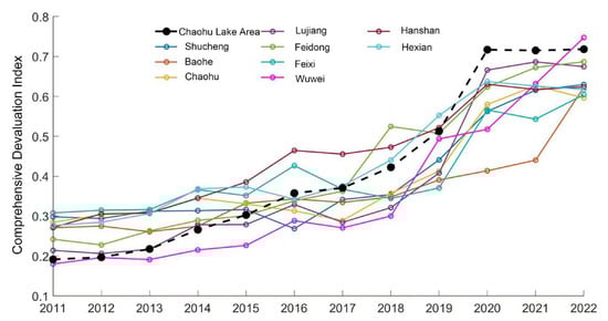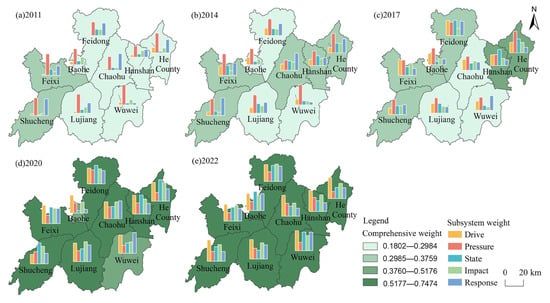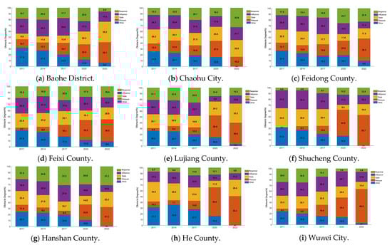 Figure 5 and Figure 6 illustrate the changes in comprehensive evaluation indices and the five subsystems in counties and districts concerning governance performance of the “three-water” in the Chaohu Lake Basin from 2011 to 2022. During the 12th Five-Year Plan period, comprehensive evaluation indices of each county exhibited fluctuating upward trends, reflecting the gradual implementation and initial effectiveness of governance measures. During the 13th Five-Year Plan period, as “three-water” governance measures advanced further, the comprehensive evaluation index steadily increased, highlighting significant progress by counties and districts in water resource management and environmental protection.