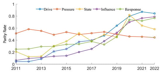 Using the entropy weight method, we processed 62 indicators reflecting governance performance of the “three-water” in the Chaohu Lake Basin from 2011 to 2022. The evaluation index of each subsystem is shown in Figure 4. The driving force index steadily increased from 0.0428 in 2011 to 0.844 in 2022, indicating significantly enhanced capacity in the basin to promote the management of water resources, water environments, and water ecology. Concurrently, rapid economic development increased social participation. The stress index displayed a slight downward trend, signifying higher environmental pressure during the early stages of water management, likely due to resource consumption and pollution resulting from rapid urbanization and industrialization. However, as governance measures were gradually implemented, these pressures effectively decreased. The state index fluctuated notably, increasing from 0.209 in 2011 to 0.582 in 2022. This considerable fluctuation indicated the systematic improvement and optimization of water resources, water environments, and water ecology in the basin, with gradually emerging governance effectiveness. The impact index exhibited slight fluctuations between 2011 and 2015 but significantly rose after 2017, reaching 0.789 in 2022. This trend suggested increasingly positive impacts of governance measures on the ecological environment and socioeconomic conditions, especially in later years. The response index steadily increased from 0.249 in 2011 to 0.768 in 2021. This trend reflected enhanced responsiveness within the basin to issues related to water resources, water environments, and water ecology, supported by effective policy implementation and governance measures.