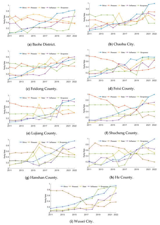 The driving force index for each county and district exhibited a steady upward trend from 2011 to 2022. For instance, the 2022 driving force indices for Wuwei City, Hanshan County, Heshan County, Shucheng County, and Chaohu City were all above 0.9. This substantial increase indicated significantly enhanced impetus for promoting the management of water resources, water environment, and water ecology, bolstered by improvements in policy support, technological innovation, and social participation, laying a solid foundation for integrated “three-water” management. The state indices of Chaohu City, Feidong County, Feixi County, Shucheng County, Hexian County, and Wuwei City fluctuated upward, suggesting the systematic repair and optimization of water resources, water environment, and water ecology, as well as initial demonstrations of effective governance.