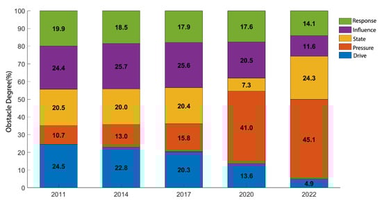 Conversely, pressure obstacle degrees increased consistently across most counties, except in Chaohu City, especially, notably, in 2022. For example, in Hexian County, the pressure obstacle degree rose sharply from 10.2% in 2011 to 50.3% in 2022, and, in Wufei City, it rose from 5.1% to 60.8%. These increases indicated intensifying environmental pressures, likely attributable to resource consumption, pollution stemming from urbanization and industrialization, and growing populations.