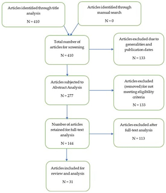 The reviewers removed 133 articles through abstract analysis because their purpose and findings did not answer the research question effectively. The remaining 144 articles were subjected to full-text analysis to ensure they contained relevant content. According to Espindola et al. [51], full-text analysis involves reading through each article to understand the content, structure, methodology, findings, and conclusions. The comprehensive nature of textual analysis helps in identifying mistakes that were probably overlooked during abstract analysis [56,57]. After full-text analysis, the researchers settled on 31 articles for inclusion in the systematic review. The remaining articles were also used as references in the study to support various arguments. Figure 1 below illustrates how the PRISMA model was applied in selecting and evaluating the articles. The PRISMA checklist document is provided in the Supplementary Materials (see Table S1).
