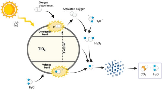 TiO2 is a well-established photocatalyst that has garnered extensive attention for its capacity to degrade MPs. It is a semiconductor material with a wide bandgap, approximately 3.0 electron volts (eV) in the case of rutile and approximately 3.2 eV for anatase, which predominantly absorbs ultraviolet (UV) radiation [38]. The photocatalytic activity of TiO2 is attributed to its capacity to generate electron-hole pairs upon light absorption. These electron-hole pairs subsequently interact with water and oxygen, resulting in the formation of reactive oxygen species, including hydroxyl radicals (•OH) [39]. These ROS are highly active and play a crucial part in the breakdown of organic contaminants, including MPs, by fragmenting intricate polymeric structures into simpler, harmless components [40].