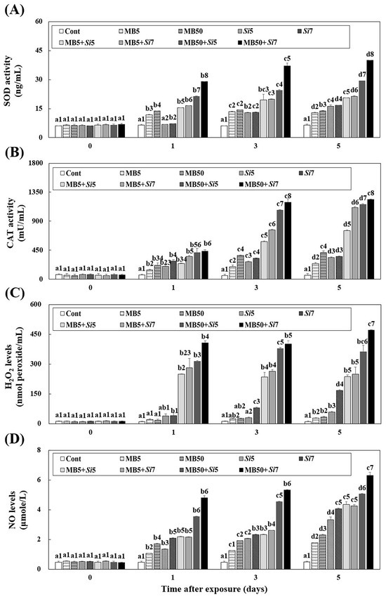 Changes in the livers of Korean rockfish, following a five-day exposure to microbeads (MB) and Streptococcus iniae (Si), were measured. These measurements specifically tracked alterations in (A) superoxide dismutase (SOD) activity, (B) catalase (CAT) activity, (C) hydrogen peroxide (H2O2) levels, and (D) nitric oxide (NO) levels. Varying letters communicate substantial statistical distinctions (p < 0.05) regarding activity among Korean rockfish across various experimental groups and exposure times. These groups include single exposures (MB5, MB50, Si5, Si7), combined exposures to MB and S. iniae (MB5+Si5, MB5+Si7, MB50+Si5, MB50+Si7), and a control group (Cont). Different numbers highlight statistically significant variations (p < 0.05) in expression among Korean rockfish that received different treatments and concentrations, specifically when compared at identical exposure times. The mean value, accompanied by its standard deviation, is indicated for each entry, with computations based on three independent assessments (n = 3).