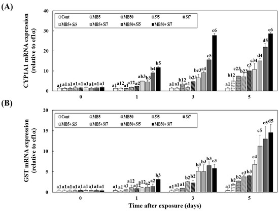 This study examined the changes in CYP1A1 mRNA expression in the livers of Korean rockfish after exposure to MB, S. iniae, or a combination of both (Figure 2A). Except for the Cont group, CYP1A1 mRNA expression increased over time in both the single- and combined-exposure groups. An absence of meaningful disparities in CYP1A1 mRNA expression was found between the Cont and single-exposure groups, except for Si7 on days 1 and 3 (p > 0.05). On day 5, the combined-exposure groups, excluding MB5+Si5 (10.71 ± 3.05), exhibited significantly higher expression levels than the single-exposure groups (p < 0.05). Notably, the MB50+Si7 (28.59 ± 0.84) group displayed significantly higher CYP1A1 mRNA expression than the other combined-exposure groups on day 5 (p < 0.05). As shown in Figure 2B, 5 days after exposure, the GST mRNA expression levels in the combined-exposure experimental group were higher than those in the single-exposure experimental group (p < 0.05). There were no significant differences among the combined experimental groups, except for the low-concentration MB and S. iniae combined experimental group (MB5+Si5) (p > 0.05).