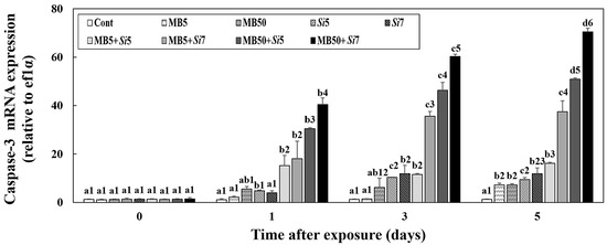 The changes in caspase-3 mRNA expression levels in the livers of Korean rockfish following exposure to MB, S. iniae, or a combination of both are shown in Figure 5. On day 1 post-exposure, the single-exposure groups did not exhibit a significant difference in caspase-3 mRNA expression compared to the Cont (p > 0.05). However, the MB50+Si7 (70.44 ± 1.47) group exhibited significantly higher caspase-3 mRNA expression levels than the other groups on day 5 (p < 0.05). Furthermore, on days 3 and 5, the combined-exposure groups, excluding MB5+Si5 (day 3; 11.52 ± 0.43, day 5; 16.17 ± 0.41), exhibited higher caspase-3 mRNA expression levels than the single-exposure groups (p < 0.05).
