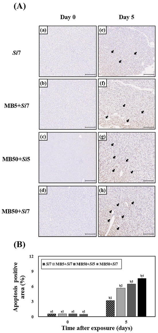 The TUNEL assay was performed on the Si7, MB5+Si7, MB50+Si5, and MB50+Si7 experimental groups on days 0 and 5. These groups were selected based on the caspase-3 mRNA results to determine how differences in MB concentration affected the combined-exposure groups. The liver was stabilized in 10% neutral buffered formalin (F0196RG, BYLABS, Hanam-si, Republic of Korea). The DeadEnd™ Colorimetric TUNEL System (G7131, Promega, Madison, WI, USA) was applied for detecting apoptotic cells, strictly following the manufacturer’s protocol. Visualization of TUNEL-positive cells was accomplished with an Eclipse Ci optical microscope (Nikon Eclipse Ci, Tokyo, Japan). ImageJ 1.54 (LOCI, Madison, WI, USA) was used to measure signal intensity and thereby calculate the apoptotic area ratio.