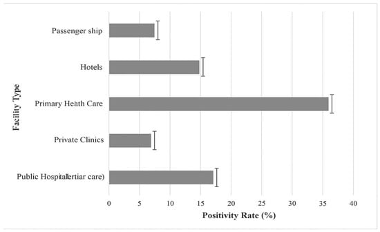 Legionella positivity rates (>50 CFU/L) by facility type, with 95% Wilson confidence intervals. The highest rates were observed in primary healthcare units and public hospitals. Error bars represent 95% CIs around the observed proportions.