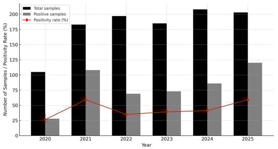 Annual positivity rate of Legionella spp. in environmental water samples from various facilities in Crete (2020–2025). Black bars represent the total number of samples collected per year, and grey bars indicate the number of samples testing positive for Legionella spp. The red line shows the annual positivity rate (%) along with 95% confidence intervals (Clopper–Pearson method), providing a measure of statistical uncertainty.
