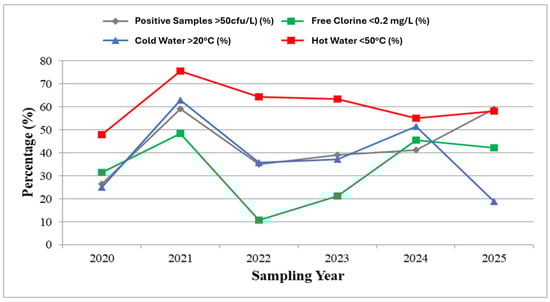 Furthermore, Figure 3 shows declines in the water quality and Legionella proliferation between 2020 and 2025. It is noted that 2020 is the initial pandemic year. A relatively low positivity rate, 26.42%, was observed in 2020. Nonetheless, the chlorine levels (<0.2 mg/L) were 31.58% of the samples and extensive hot water temperatures were below the 50 °C safety standard. In 2021, there was an extensive increase in Legionella positivity, with its value rising to 59.17%. This rise coincides with a significant increase in water quality violations since chlorination and temperature parameters showed chlorine insufficiency (<0.2 mg/L) and temperature noncompliance in hot 75.53% and cold 63.04% samples respectively.