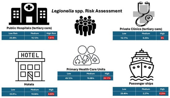 Risk classification of Legionella spp. positive samples by facility type. Risk categories defined according to ELDSNet as low (<103 CFU/L), medium (103–<104 CFU/L), and high (≥104 CFU/L). Primary health care units exhibit the highest proportion of high-risk samples (20.17%), followed by passenger ships (6.25%) and hotels (4.60%).