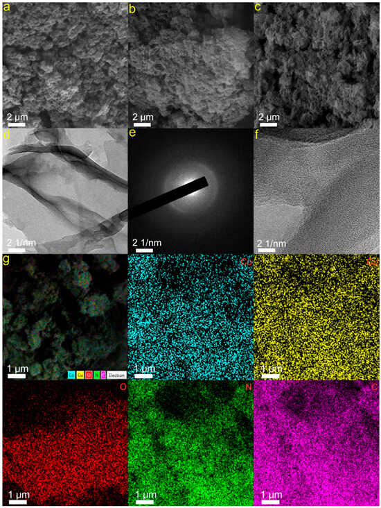 SEM and TEM were employed to investigate the microstructural properties of CN and Cu–Co–O-g-C3N4. Figure 1a–c show that both catalysts exhibited a similar platelet-like layered morphology, suggesting that oxygen incorporation had minimal impact on their overall structure. TEM observations (Figure 1d) further supported this finding, revealing well-ordered stacked layers at the catalyst edges.