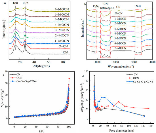 (a) XRD patterns, (b) FTIR spectra, (c) N2 adsorption–desorption isotherms of 5-MOCN, and (d) pore size distribution of catalysts of 5-MOCN.