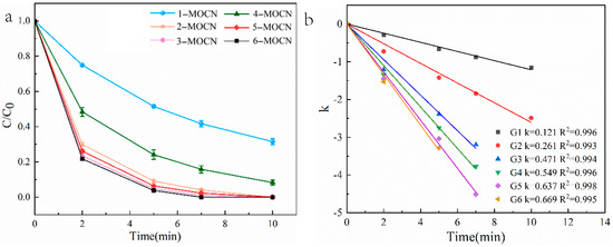 The influence of the doped bimetal mass ratio of Cu–Co–O-g-C3N4 on the SXM degradation process was investigated and is shown in Figure 3. With the increase in the mass of the doped bimetal, an evident increase in the SMX removal efficiency was obtained (Figure 3a) [15]. This is attributed to the large number of activated sites reacting with PMS, which were introduced into the g-C3N4 by doping the Cu-Co bimetal. In addition, the rate constant (k) markedly rose with the increase in the mass of the doped bimetal. When the doped bimetal mass ratio rose to 0.229 mg, the rate constant of Cu–Co–O-g-C3N4/PMS systems reached 0.669 min−1. Notably, from 4-MOCN to 6-MOCN, the degradation curves almost overlapped, suggesting that the improvement in the reaction rate became slight [16]. Thus, taking economics into account, G5 was selected as the optimal activator for the subsequent experiments [17]. We examined the concentration of metal ions in the solution after the reaction and found that the level of dissolved metal ions was very low (0.01 mg/L), making it environmentally friendly.