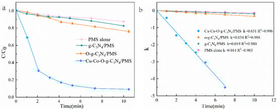 The SMX degradation via activated PMS with different activators is shown in Figure 4a. The removal efficiency was 10%, 14%, 22%, and 90%, respectively, by PMS alone, g-C3N4/PMS, O-g-C3N4/PMS, and the 5-MOCN/PMS system. SMX was removed by the 5-MOCN/PMS system within 10 min compared with the PMS alone [18], g-C3N4/PMS, and O-g-C3N4/PMS systems [16]. In addition, as shown in Figure 3b, the correlation coefficients were all higher than 0.98, indicating that the SMX degradation process followed pseudo-first-order kinetics. The reaction rate of the 5-MOCN /PMS systems (0.63 min−1) increased compared with O-g-C3N4 (0.034 min−1) and g-C3N4 (0.014 min−1), illustrating that the catalytic activity of g-C3N4 was promoted by the codoped Cu–Co bimetal and oxygen, which further suggested that the 5-MOCN had superior activation activity in SMX elimination [19]. We also did surface adsorption experiments and found almost no adsorption effect, which was corroborated by the smaller specific surface area in the BET test.