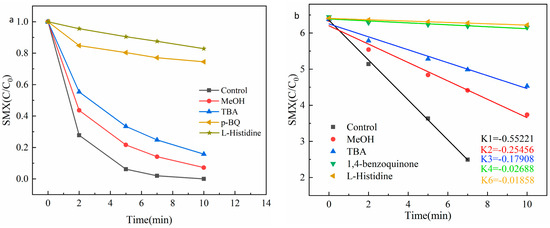 (a) The effect of catalyst on SMX degradation; (b) reaction rate constants (k). ([catalyst]= 0.2 g/L, [SMX] = 10 mg/L, [PMS] = 0.8 mM, [T] = 25 °C).