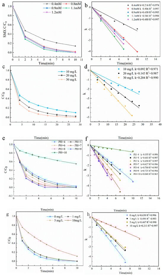 (a) The effect of different PMS concentrations on SMX degradation; (b) reaction rate constants (k) ([catalyst] = 0.2 g/L, [SMX] = 10 mg/L, [PMS] = 0.8 mM, [T] = 25 °C). (c) The effect of different catalyst concentrations on SMX degradation; (d) reaction rate constants (k), ([SMX] = 10 mg/L, [PMS] = 0.8 mM, [T] = 25 °C). (e) The effect of different pHs on SMX degradation; (f) reaction rate constants (k) ([catalyst] = 0.2 g/L, [SMX] = 10 mg/L, [PMS] = 0.8 mM, [T] = 25 °C). (g) The effect of different humic acids on SMX degradation; (h) reaction rate constants (k) ([catalyst] = 0.2 g/L, [SMX] = 10 mg/L, [PMS] = 0.8 mM, [T] = 25 °C).