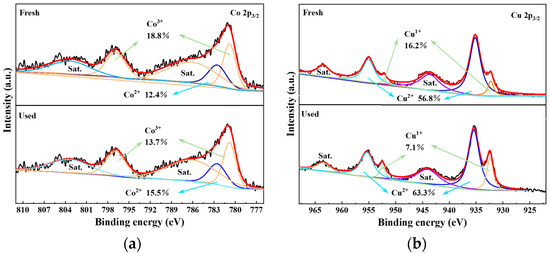 XPS characterization was conducted to investigate the valence state evolution of Co and Cu species during PMS activation over fresh and spent Cu–Co–O-g-C3N4 catalysts. Post-reaction analysis indicated relative stability in the bulk elemental composition [25], although noticeable depletion of the Co and Cu content (particularly Co) was observed, implying possible metal leaching during the catalytic process. As evidenced by high-resolution XPS spectra (Figure 7b), substantial changes in oxidation states occurred: the relative abundance of Cu2+ species rose from 56.8% to 63.3%, accompanied by a proportional decrease in the Cu+ content (16.2% to 7.1%) [26], clearly demonstrating the active participation of Cu+/Cu2+ redox pairs in PMS activation. Parallel transformations were detected in the Co2+/Co3+ system, further confirming the dual-metal catalytic mechanism [27].