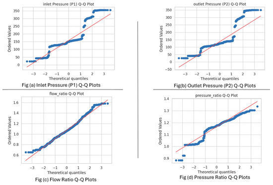 Quantile–quantile (Q–Q) plots were employed to assess the normality of the inlet pressure, outlet pressure, flow ratio, and pressure ratio distributions for the collected data (Figure 3). In these plots, the x-axis represents the theoretical quantiles assuming a standard normal distribution, while the y-axis displays the ordered values of the observed data. The flow ratio, as depicted in its Q–Q plot, likely represents a normalised measure of flow within the system, potentially the ratio of flow rates at different locations or relative to a baseline. Similarly, the pressure ratio signifies a normalised pressure measure, possibly the ratio of pressures at different points or relative to a reference pressure. Deviations of the plotted points from the diagonal red line indicate departures from a normal distribution, providing visual diagnostics critical for anomaly detection, model validation, and understanding system performance under varying conditions. Figure 3 presents the Q–Q plots for the considered parameters. For the inlet pressure (P1) and outlet pressure (P2) (Figure 3a,b), the data points generally align along the diagonal, suggesting approximate normality with minor deviations at the distribution tails, corresponding to unusual events or fluctuations in the pipeline system. For the flow ratio and pressure ratio (Figure 3c,d), a similar linear trend is observed, although some deviations are present. These deviations are essential for identifying anomalies in flow and pressure relationships, which are critical indicators of leaks or bursts. Overall, the proximity of the plot points to the normal line supports the generalisability and robustness of the modelling approach employed in this project.