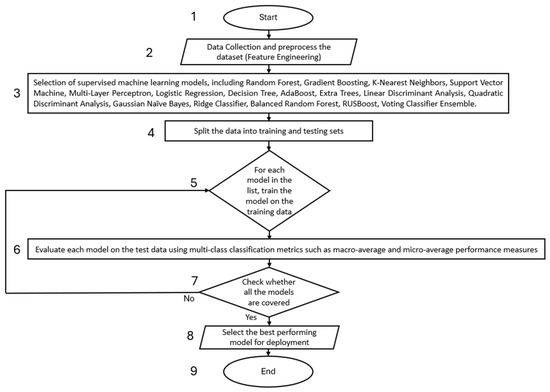 Figure 5 below shows the flow chart for the selection of the model with the best performance. The flowchart illustrates the process of selecting and validating a machine learning model for detecting leaks and bursts in water pipelines. The stages of the methodology are depicted in Figure 5, and the detailed explanations of each step are provided below: