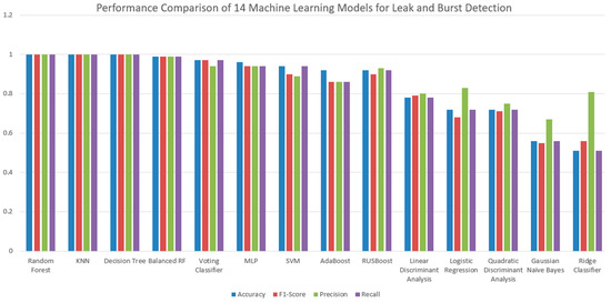 The above graphical comparison highlights that Random Forest, KNN, and Decision Tree models consistently outperform others across all performance metrics, making them ideal candidates for leak and burst detection in water distribution systems. Ensemble methods such as Balanced Random Forest and RUSBoost also show strong potential. In contrast, linear and probabilistic models underperform, likely due to their limited ability to capture complex patterns in the dataset. This confirms that tree-based and ensemble models offer the most robust solutions under the experimental conditions used.
