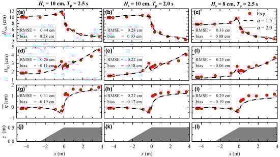 Comparison of wave heights and setup from numerical simulations with various values and experimental data. (a–c) short-wave height (), (d–f) long-wave height (), (g–i) wave setup (), and (j–l) reef model. Root mean square error (RMSE) and bias are shown in each panel.