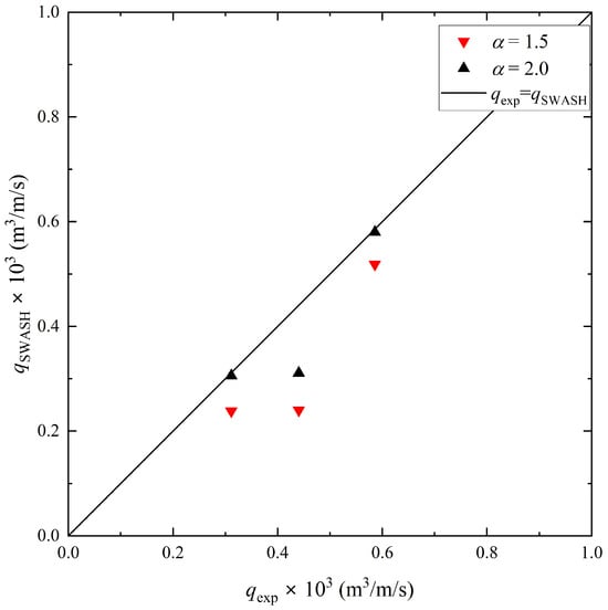 Comparison of wave overtopping rate from numerical simulations with various values and experimental data.
