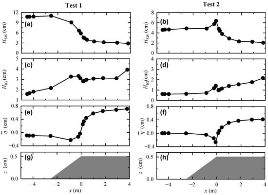 Variation in (a,b) short-wave height, (c,d) infragravity-wave height, and (e,f) wave setup over the reef, where the reef topography is shown in (g,h).