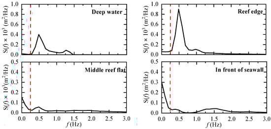 Variation in wave spectrum across the reef for Test 1, where the vertical dashed lines indicate the critical frequency that separates short-wave and infragravity-wave components.