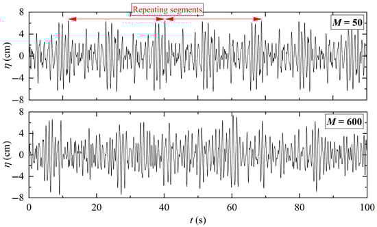 When generating waves through physical or numerical wavemakers, standard practice involves discretizing the continuous frequency spectrum into discrete frequency bins. Each bin represents an individual wave component, and their superposition produces the irregular wave train. However, a conflict arises between key requirements in the Chinese port engineering code, The Technical Code of Modeling Test for Port and Waterway Engineering (JTS/T 231-2021 [34]), issued by China’s Ministry of Transport, which requires the duration of the test ≥ 1000 waves for overtopping tests and a spectral resolution of 50 to 100 frequency bins for wave generation. However, this bin range is likely insufficient to generate 1000 non-repetitive waves. As demonstrated in Figure 7, using 50 frequency bins causes the wave time series to repeat approximately every ten waves. Consequently, a 1000-wave sequence contains numerous identical segments, invalidating the intended duration requirement. While wavemaker re-reflection introduces spurious effects on surface elevation, this constitutes a separate error source. As seen in Figure 7, increasing the number of bins to 600 significantly extends the repetition period. Therefore, this study will establish the minimum frequency bin count required to generate truly non-repetitive irregular wave sequences meeting the 1000-wave criterion for modeling overtopping.