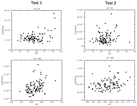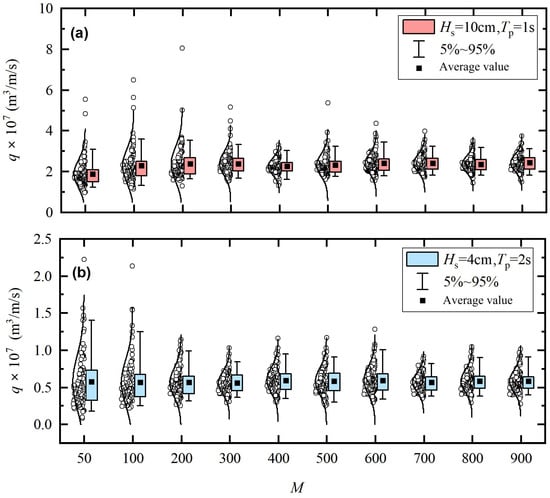 Figure 11 elucidates the dependence of overtopping rate q on the wave groupiness factor for different spectral resolutions (M frequency bins). At low spectral resolution (), the values span an unrealistically broad range (0.35–0.95), exceeding typical oceanic observations and indicating the presence of nonphysical wave train artifacts. This artificial variability obscures any systematic relationship between q and . Conversely, when M is increased to 700, the distribution contracts to physically plausible values, and a distinct positive correlation between q and emerges. This trend is consistent with the findings of Liu et al. [18], who reported a similar relationship between runup height and , thereby supporting the robustness of our simulation approach. From an experimental design perspective, these results suggest that incorporating site-specific information can substantially reduce the number of required repetitions to achieve reliable overtopping estimates, enhancing both efficiency and accuracy in hazard assessment.