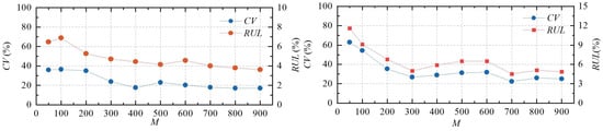 To clarify the impact of spectral resolution (M) on overtopping rate variability (q), we calculated two statistical indicators, i.e., the Coefficient of Variation () and the Range Uncertainty Level (). As shown in Figure 9, both and decrease markedly with increasing M, indicating improved consistency and reduced uncertainty in q as spectral resolution increases. Notably, both metrics stabilize when M exceeds 700, signifying statistical convergence. Therefore, for reliable overtopping experiments on vertical seawalls fronted by coral reefs, we recommend a minimum of 700 frequency bins—substantially higher than the conventional 50–100 bins typically used.