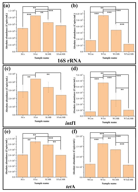Absolute abundance of 16S rRNA, intI1, and tetA in sediment samples and water samples. (a) Absolute abundance of 16S rRNA in sediment samples; (b) Absolute abundance of 16S rRNA in water samples; (c) Absolute abundance of intI1 in sediment samples; (d) Absolute abundance of intI1 in waterr samples; (e) Absolute abundance of tetA in sediment samples; (f) Absolute abundance of tetA in waterr samples (** p < 0.01, and *** p < 0.001).