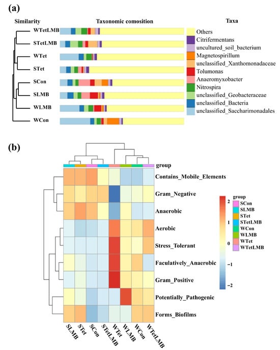 The genus-level analysis showed that both Tet and LMB interfered with the originally dominant communities (e.g., reducing unclassified_Saccharimonadales, unclassified_Xanthomonadaceae) and favored the proliferation of initially less abundant taxa (Figure 3a). Tet consistently reduced the bacterial genus richness in both the sediment (SCon: 289 vs. STet: 269) and water (WCon: 322 vs. WTet: 308) (Figure 2b,c), which is indicative of its inhibitory or selective action against susceptible bacteria. LMB increased the genus richness in the sediment (SLMB: 299), potentially by creating organic-matter-rich microenvironments conducive to microbial diversity [48], but decreased it in water (WLMB: 308), possibly due to coprecipitation effects [49,50]. The cluster analysis indicated that the Tet addition (alone or with LMB) drove the convergence in the bacterial community composition between sediment and water samples (Figure 3a), possibly due to the selective effect of antibiotics.