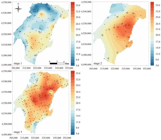 - The findings regarding the spatial distribution characteristics of Mg2+ concentration reveal that from stage 1 to stage 3, the high-value area of Mg2+ concentration within the mining area has gradually migrated from its original southern location towards the east. Moreover, with the ongoing exploitation of brine, the high–value area of Mg2+ concentration has gradually expanded from the east towards the central part of the mining area.