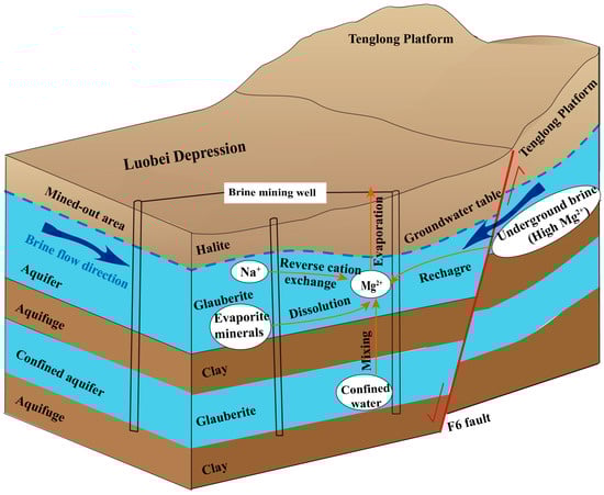 - There were three primary factors contributing to the increase in Mg2+ concentration within the mining area. Firstly, the brine in the mining area has undergone long–term dissolution and evaporation-concentration processes. The dissolution of magnesium–bearing minerals has augmented the Mg2+ content in the brine. Secondly, reverse cation exchange has occurred, where in Na+ in the brine displaces Mg2+ in the aquifer medium, leading to elevated Mg2+ levels. Thirdly, brine mining has accelerated the flow of groundwater in the mining area and simultaneously intensified the recharge of peripheral groundwater to the mining area. The mixed recharge of groundwater rich in Mg2+ from the Tenglong Platform, Tienan fault depression and confined brine in Luobei depression was also one of the contributing factors to the increase in Mg2+ content in the mining area.