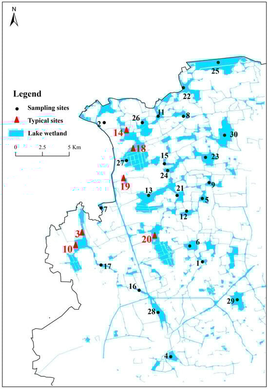 The river network in the northern plain of Jiaxing was selected as the study site (Figure 1). The point map in Figure 1 shows all the points used in the project, and there are a large number of them. For the current study, considering the workload, the number of points has been reduced. Points 3, 10, 14, 18, 19, and 20 were selected as the research objects of this paper because these areas are representative. Samples were collected in October 2023. The sediment was collected using a sampler, and the samples were subsequently categorized into five layers according to the depth at which they were collected. These layers were designated as follows: surface (5 cm), second layer (15 cm), third layer (25 cm), fourth layer (35 cm), and bottom layer (45 cm). Additionally, the overlying water was collected as water samples, and the water temperature and pH were determined on-site using a multiparameter water quality meter (HACH HQ40d). All samples were transported back to the laboratory within 12 h for pre-treatment. Sediment microbial samples were stored in a −80 °C refrigerator. The sample’s SRP was determined spectrophotometrically (UV-1900i, Shimadzu Enterprise Management Co., Ltd., Kyoto, Japan) in accordance with the procedure outlined in the Chinese Environmental Standard Law. Phosphorus TP, Fe-P, OP, L-P, BD-P, Al-P, and Ca-P in sediment forms were determined with reference to the previous literature [17].