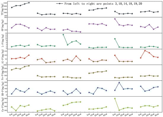 Phosphorus in sediments exists in a variety of forms. Phosphorus can be categorized as TP (total phosphorus), OP (organic phosphorus), L-P (soluble and loosely bound phosphorus), Fe-P (iron-bound phosphorus), Al-P (aluminum-bound phosphorus), Ca-P (calcium-bound phosphorus), and BD-P (reductant soluble phosphorus). The collective term “mobile phosphorus” is used to refer to L-P, Fe-P, and OP [4]. Phosphorus is unevenly distributed in the soil environment [5]. The analysis of surface sediment phosphorus concentrations alone is insufficient for determining the phosphorus status of sediments. This underscores the necessity of examining the vertical profiles of sediment phosphorus at various depths. Prior research has examined the spatial heterogeneity of soil total phosphorus (TP) at various spatial scales [6]. Research [7] has reported the vertical distribution of inorganic phosphorus in wetlands. Research [8] has also explored the distribution of phosphorus by depth in sediments at different times of cyanobacterial growth.