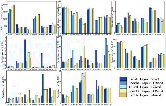 Figure 2 illustrates the distinctive attributes and patterns of vertical distribution of individual forms of phosphorus across the sedimentary layers. TP concentrations range from 633.9 to 2534.7 mg/kg, which is relatively high [6]. Fluctuating surface-to-bottom concentrations related to phosphorus input, output, and accumulation in the sediments [21]. It can be clearly seen that the TP concentration at site 3 is significantly higher than at the other sites. This is mainly because the lakeshore is surrounded by paddy fields and artificial fishponds, and the influx of large quantities of fertilizers and feeds increases the levels of phosphorus in the sediments [22]. The adsorption of phosphorus in sediments is primarily facilitated by clay minerals, metal (Fe, Mn, and Al) oxides, and hydroxides. Phosphorus adsorbed on inorganic components becomes inorganic phosphorus [23], and organic phosphorus is contained in settled organic matter [24]. Furthermore, certain microorganisms are capable of accumulating phosphorus in the form of polyphosphates [25].