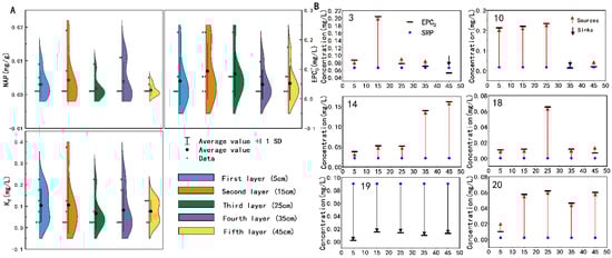 The difference between EPC0 and SRP determines whether sediment plays a “source” or “sink” role [37]. At EPC0-SRP > 0, sediments act as a “source” of phosphorus and are at risk of releasing phosphorus to the overlying water. At EPC0-SRP < 0, sediments act as phosphorus “sinks” and are at risk of adsorbing phosphorus. And when the difference between parameter EPC0 and SRP is larger, the role of “source” or “sink” is more significant. As can be seen from Figure 4B, all points show EPC0 > SRP, except for point 19 and very few stratifications. This suggests that the majority of sediments act as phosphorus “sources” with a tendency to release phosphorus to the overlying water.