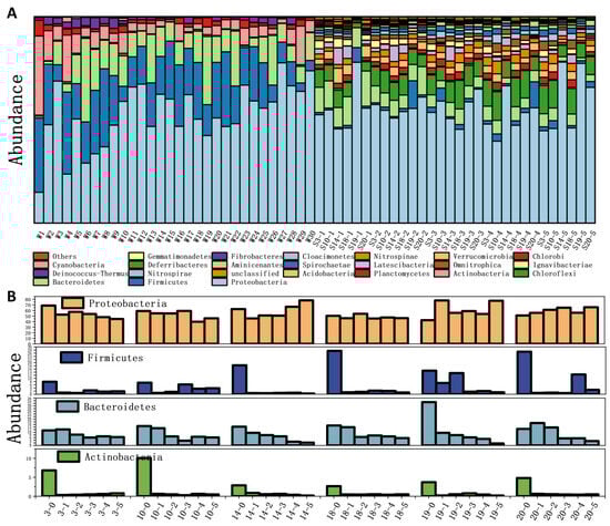 Phosphorus-solubilizing microorganisms have been found in several phyla such as Actinobacteria, Ascomycota, Bacteroidetes, Basidiomycota, Euryarchaeota, Firmicutes, Mucoromycota, and Proteobacteria [45]. The dephosphorylating bacteria are mainly grouped into eight phyla, of which the dominant bacteria are Proteobacteria, Firmicutes, Bacteroidetes, and Actinobacteria [45]. This study, therefore, focuses on these four sectors. As can be seen from Figure 5B, the relative abundance of microorganisms in each layer showed significant heterogeneity. The relative abundance of Proteobacteria showed fluctuation from the surface layer to the bottom layer, as the 3, 10, 18, and 20 points show more abundance in the middle layer, and the 14 and 19 points show more abundance in the bottom layer. The relative abundance of Proteobacteria in the surface layer is not the highest layer. The fluctuating pattern of relative abundance of Firmicutes is stronger, with higher relative abundance in the middle layers. This may be due to the fact that the abundance of Firmicutes in the sediments is positively correlated with the degree of eutrophication [46]. The pattern of change in the relative abundance of Bacteroidetes is obvious, mostly showing a decreasing phenomenon from the surface layer to the bottom layer. In short, the surface layer is the most abundant layer. This pattern is consistent with previous findings [15]. Actinobacteria showed little regularity of change in relative abundance and were the least abundant of the four phyla.